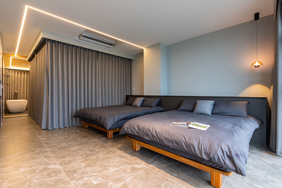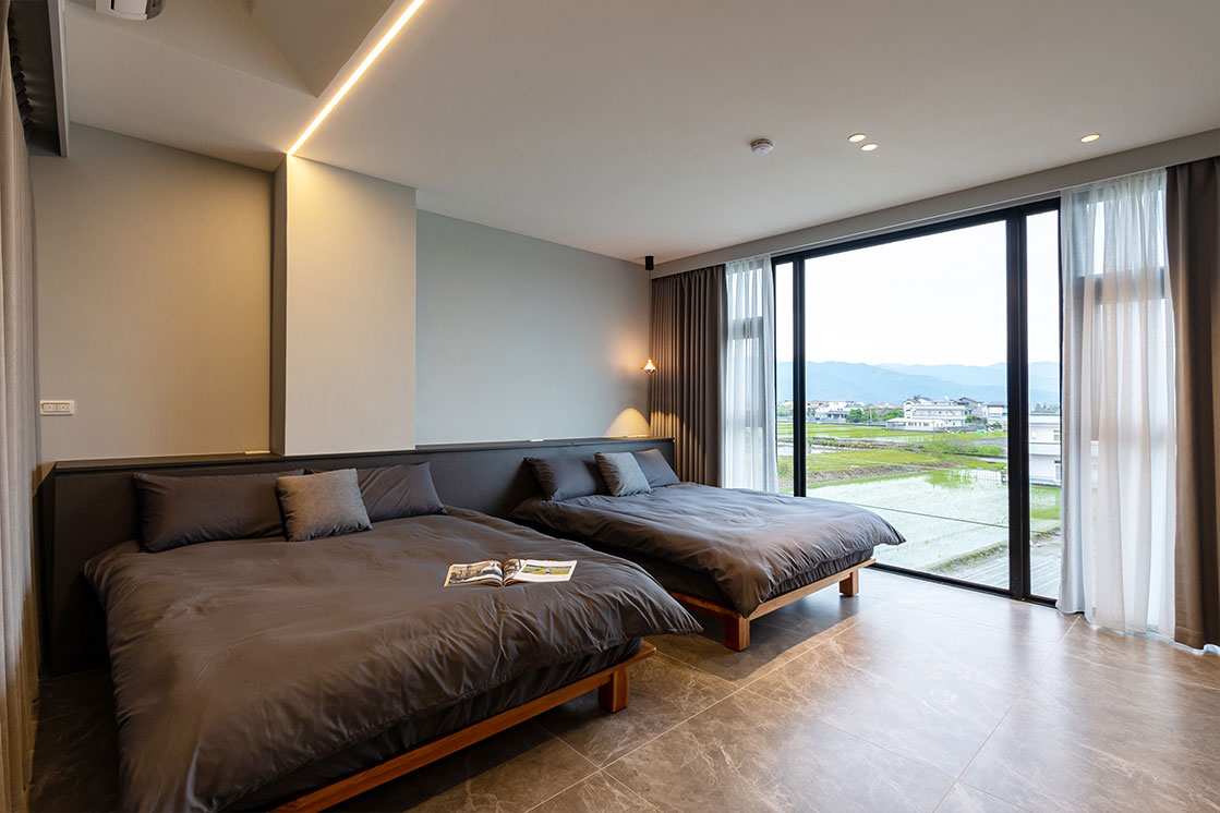 尋見777民宿:客房提供四人景觀套房,部份房型備有浴缸,每間皆設有對外落地窗,一眼望去便是壯闊的山景與遼闊田野,清晨鳥鳴喚醒美好,夜晚星空伴您入眠。